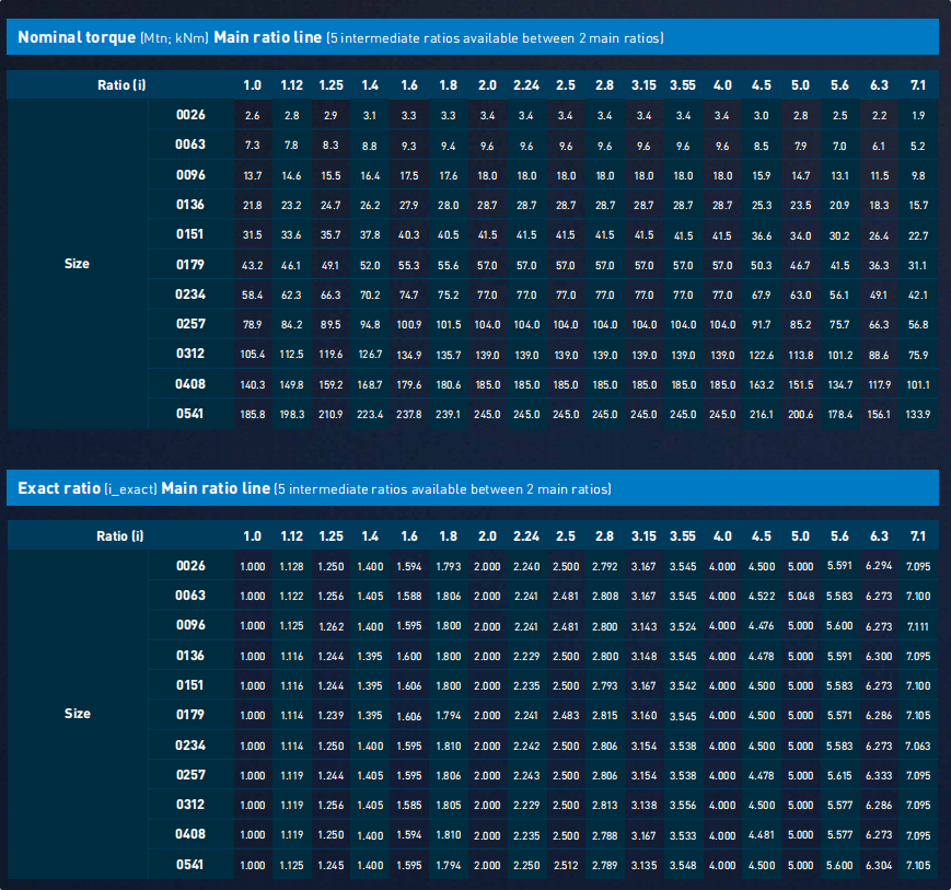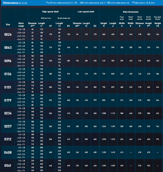 Combining the 11 physical sizes (0026 to 0541) and 18 primary rated transmission ratios (1.0 to 7.1) available in the FLENDER ONE series, the complete list of full model numbers for FLENDER ONE single-stage products—specifically covering the horizontal + solid shaft configuration—is provided below: